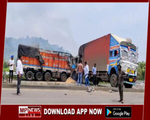 गणपति घाट पर टक्कर के बाद कंटेनर और ट्रक दोनों में ही आग लग गई।